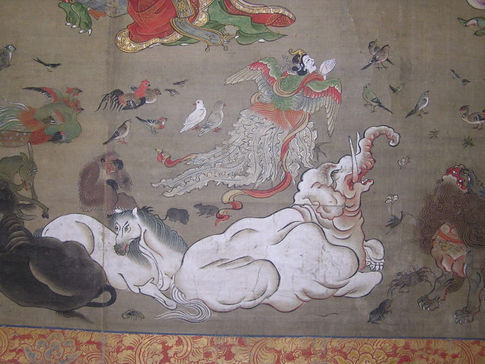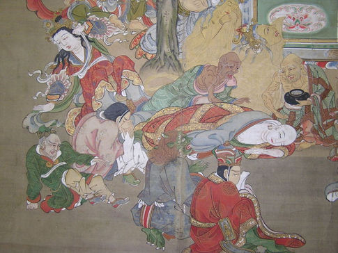 涅槃経』という経典に基づいて描かれている涅槃図は拘尸那竭羅(クシナガラ)の沙羅双樹の間において